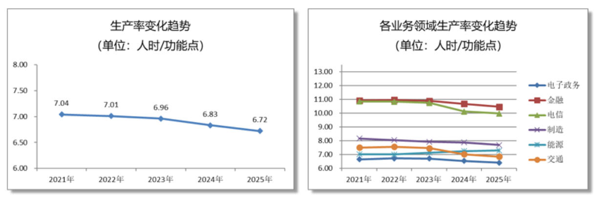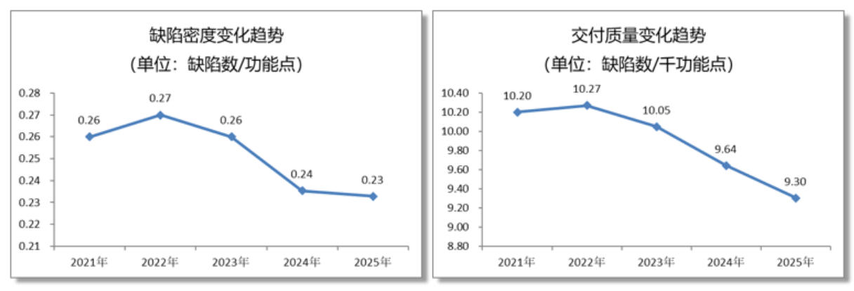 近年来,缺陷密度与交付质量基本稳定并持续向好,缺陷密度中值呈震荡下行趋势。2025年缺陷密度中值为0.23/功能点,交付质量中值为9.30/千功能点,交付质量稳步提升(数值越低代表质量越高)。注:缺陷密度是指项目交付前各类测试活动发现的缺陷总和;交付质量是指项目交付后6个月内发现的缺陷总数。