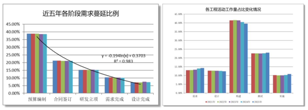 2025年软件开发各工程活动工作量分布变化不大,各阶段规模变更因子总体稳定。其中,需求、测试与实施工作量占比略有提升,设计与构建工作量占比则略有下降。